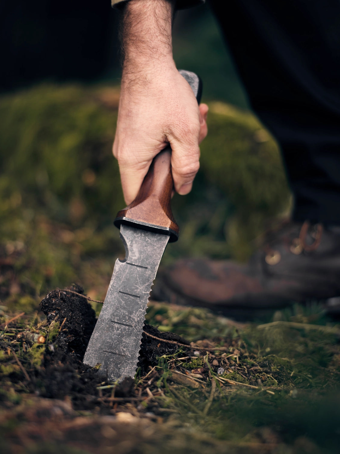 Originally designed to mimic the popular Japanese Garden Knife, hori hori roughly translates to “dig dig”. This hearty, multi-purpose tool is built for versatility. Pound in tent stakes with the flat pommel base. Measure planting depth with the handy inch marks. Saw a branch or whittle kindling with the rust-resistant doubled edge. Made for use in the backyard, camping, bush-crafting, or anywhere you need it.