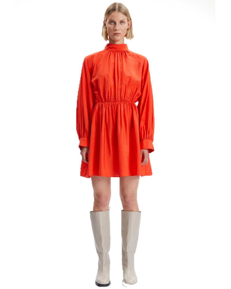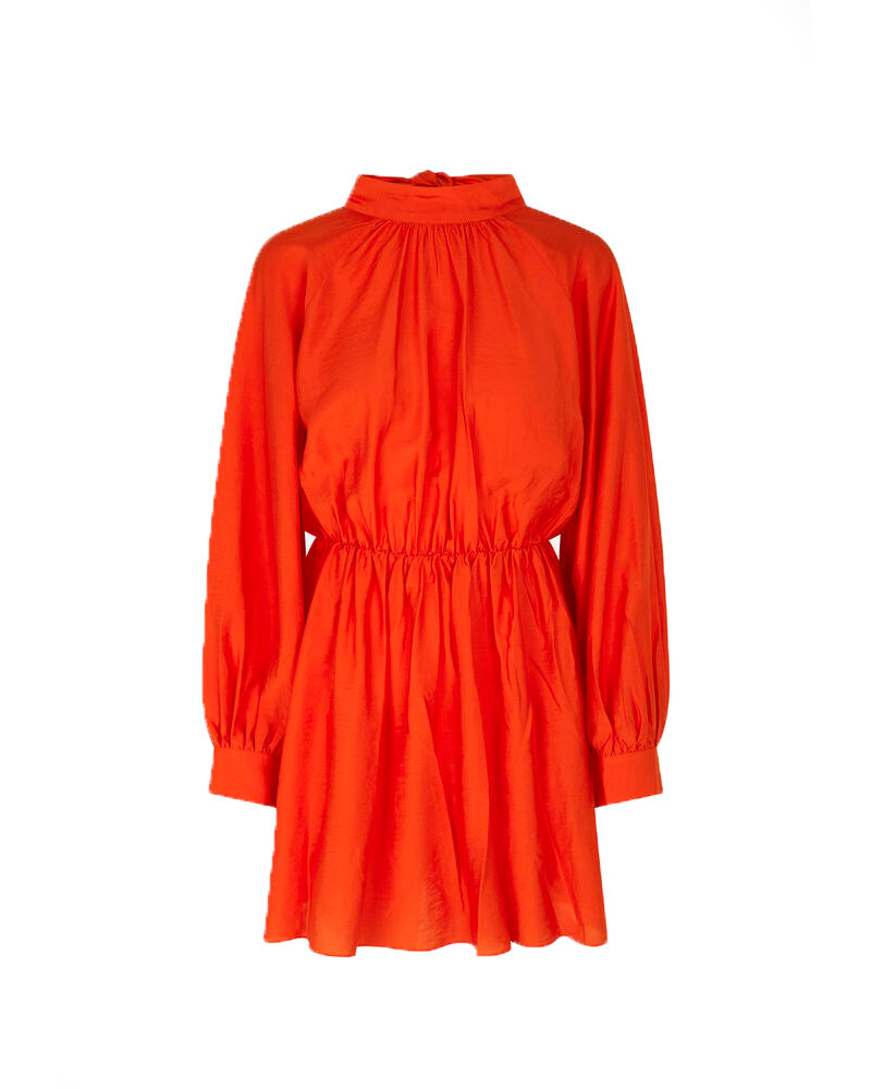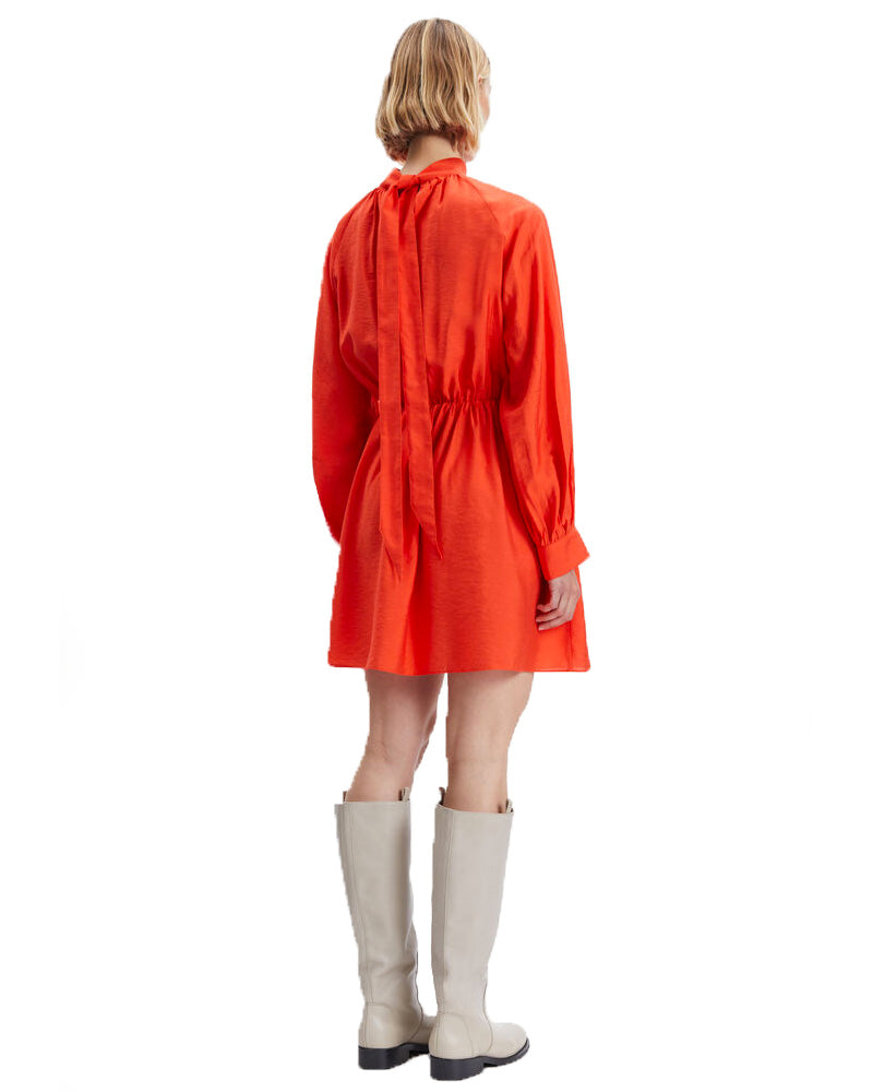 Red 'Ebbali' mini dress from Samsoe Samsoe. Made of silk, this design features an elasticated waist, stand collar with a decorative tie at the back and long puff sleeves with buttoned cuffs.