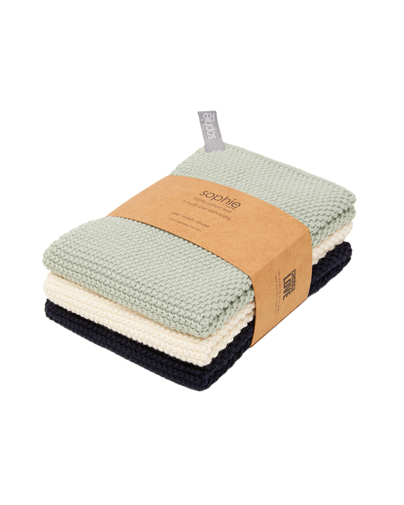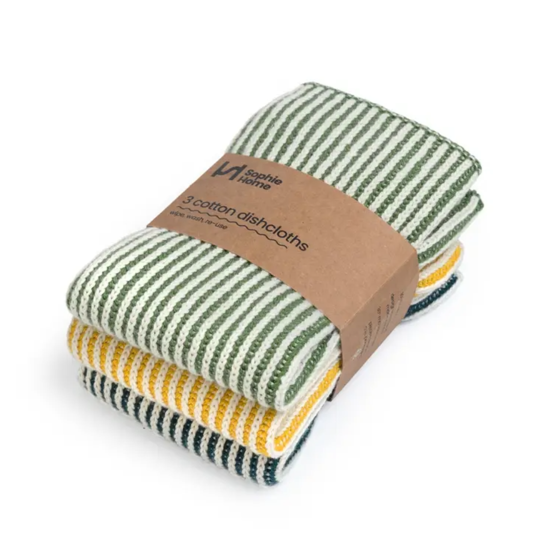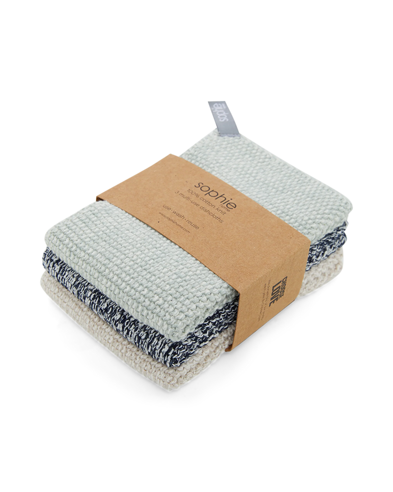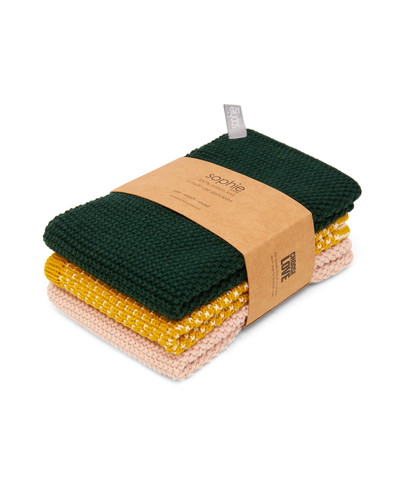 Sophie Home Reusable & Eco-Friendly Cotton Knit Dishcloths. There are so many advantages to reusable machine washable cotton knit dishcloths; environmentally they are more friendly - they won't leave microscopic plastic deposits which make their way into our oceans, and they don't start to smell over time, like other dishcloths.