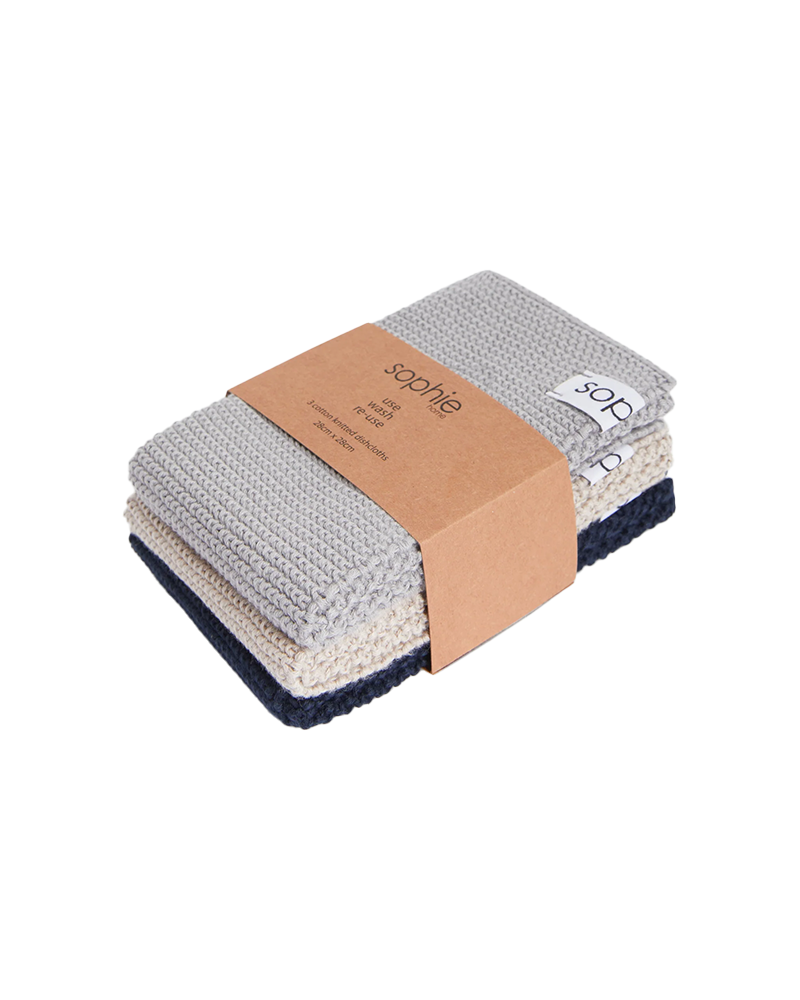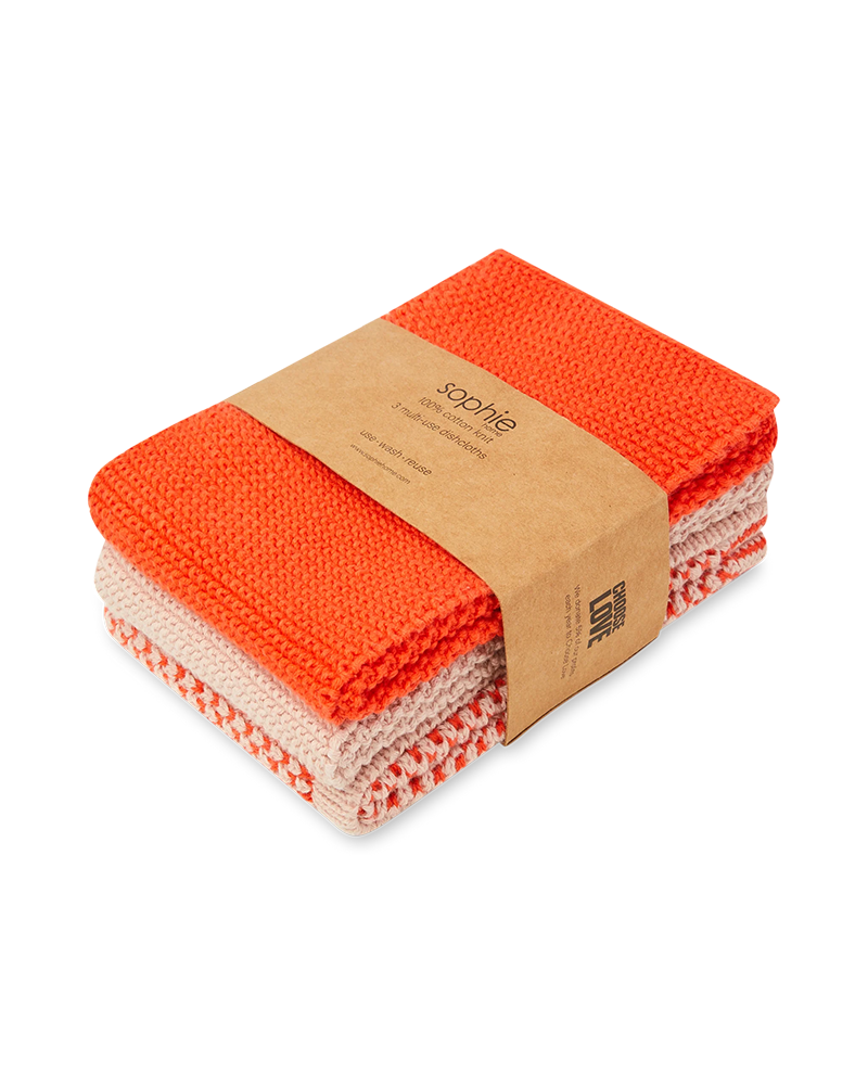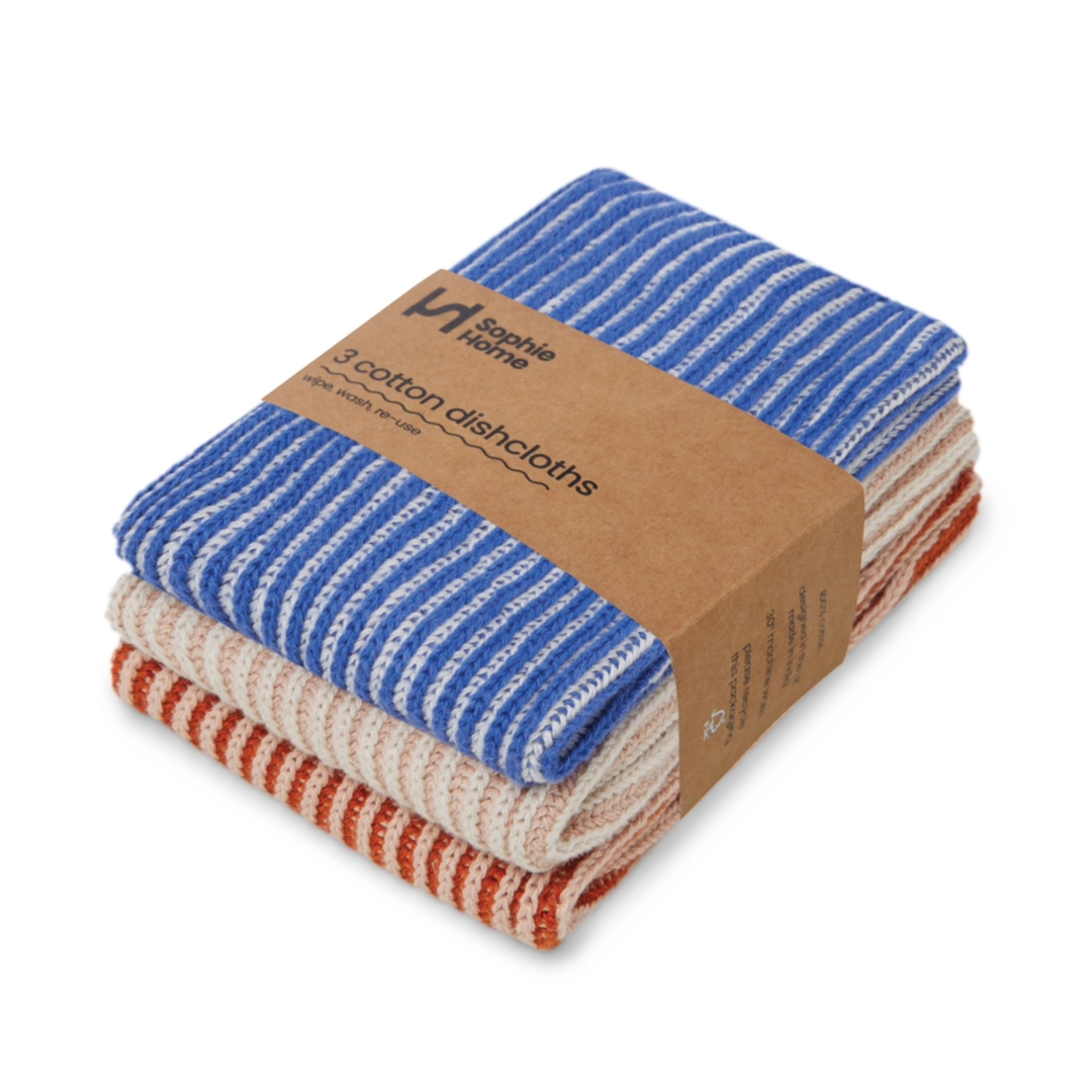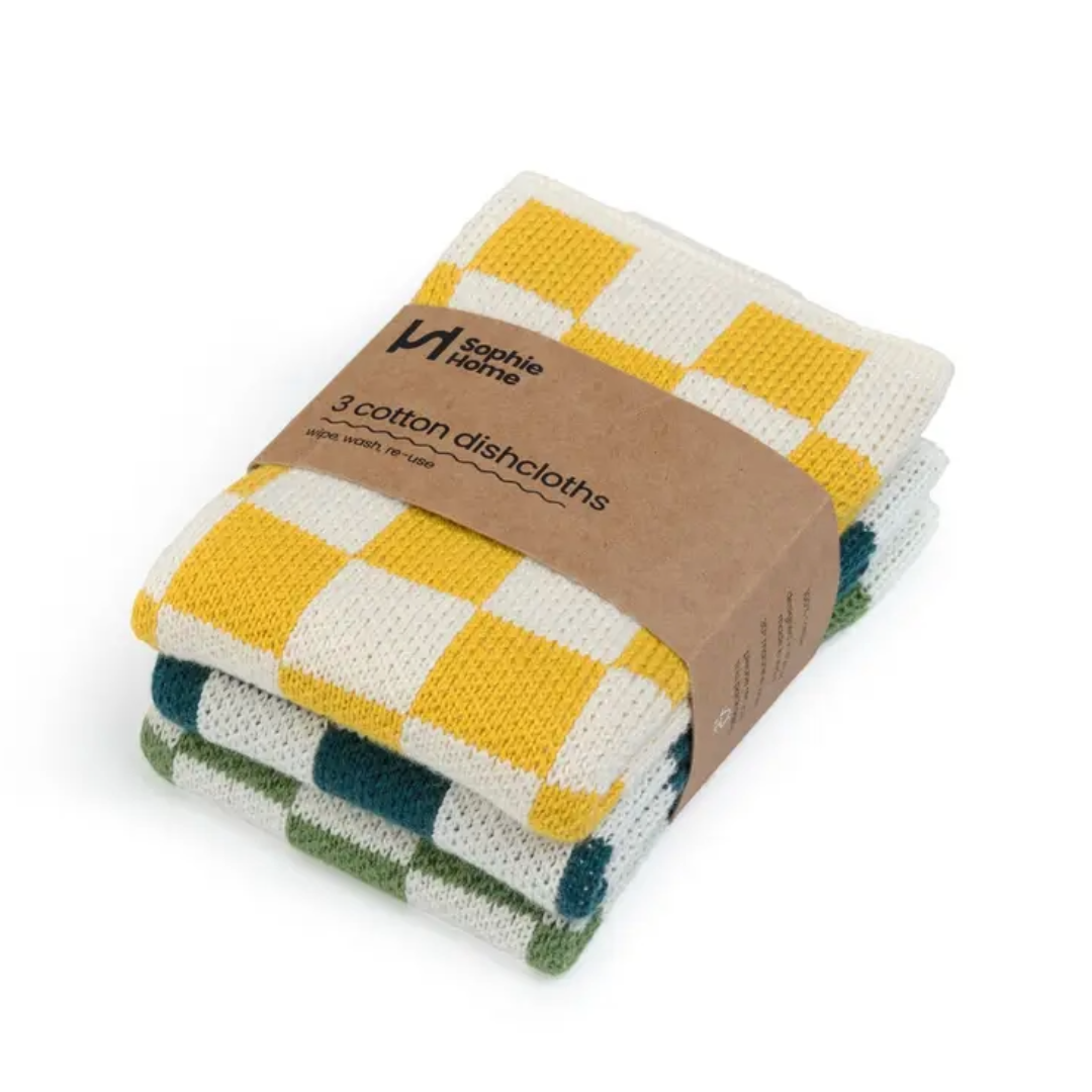 Sophie Home Reusable & Eco-Friendly Cotton Knit Dishcloths. There are so many advantages to reusable machine washable cotton knit dishcloths; environmentally they are more friendly - they won't leave microscopic plastic deposits which make their way into our oceans, and they don't start to smell over time, like other dishcloths.